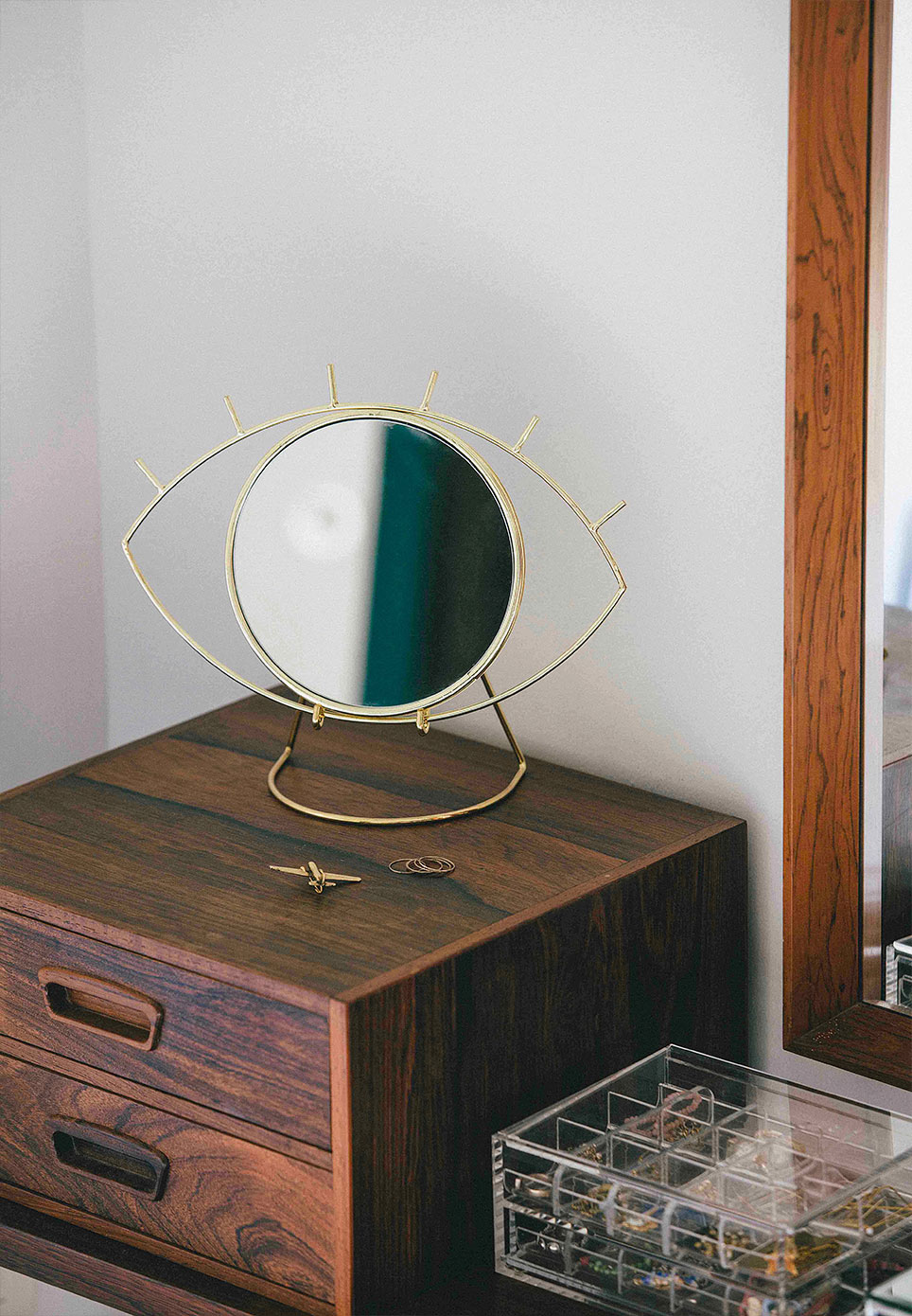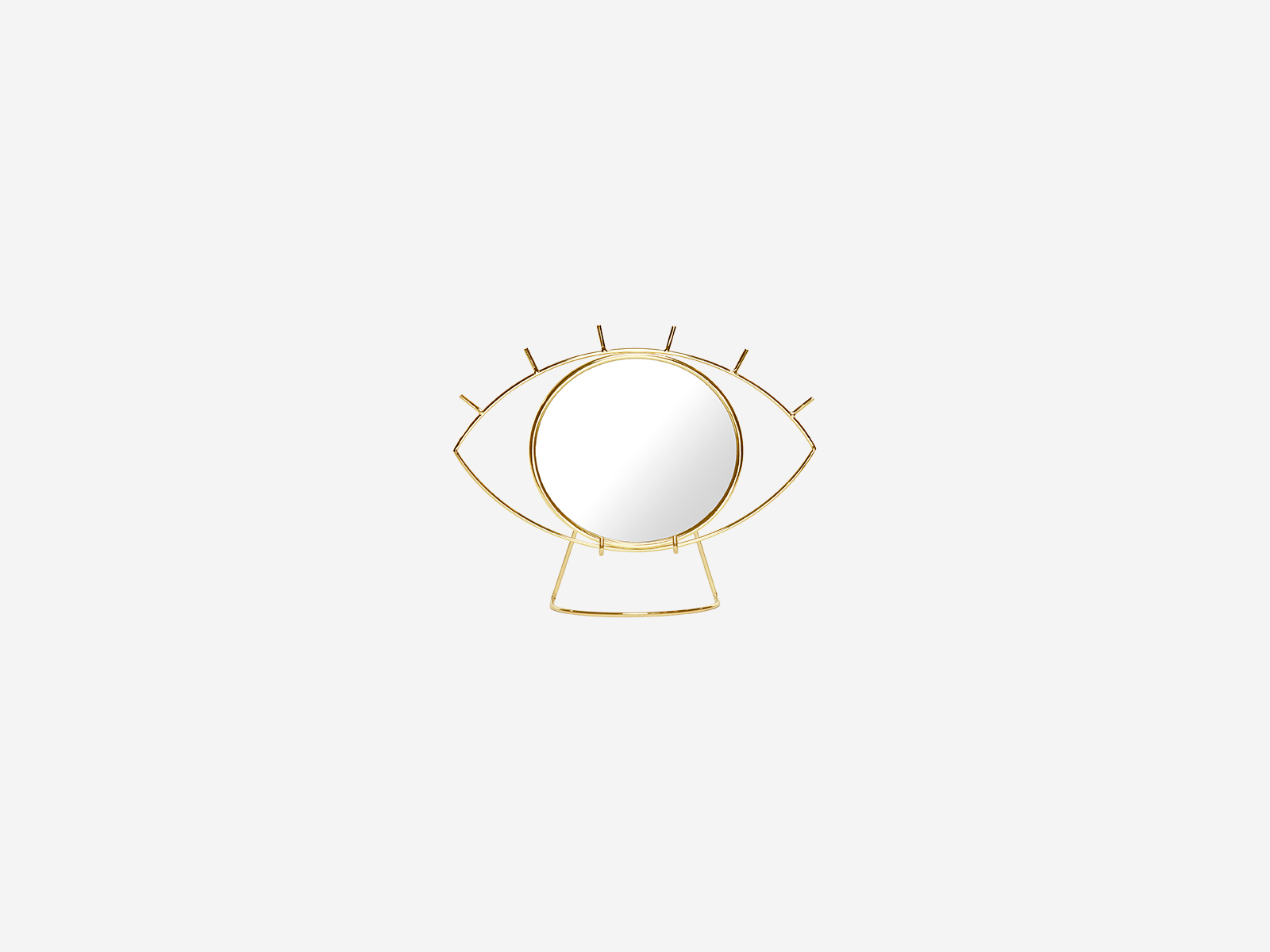 Espejo de sobremesa contemporáneo y elegante, con forma de ojo gráfico con un dorado dorado y base extraíble para un fácil momento de maquillaje.