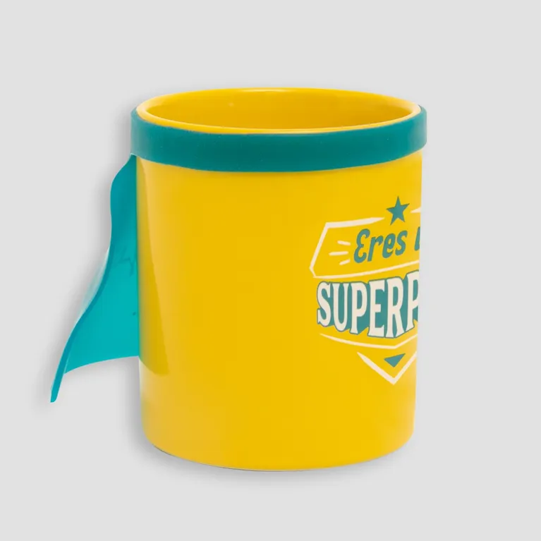 Llamativa taza de cerámica, con mensaje y una original capa de superhéroe extraíble hecha en silicona.