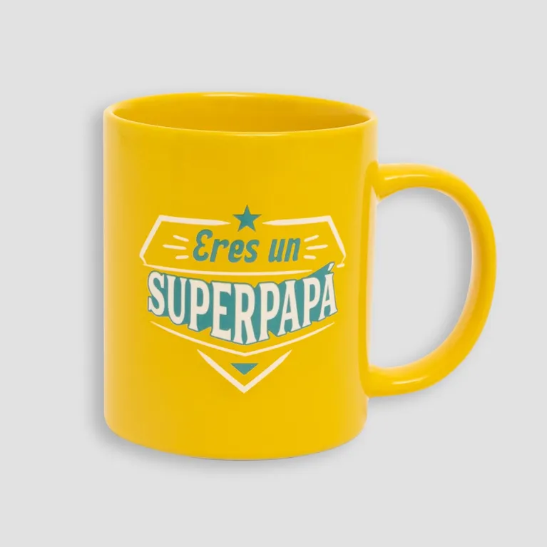 Llamativa taza de cerámica superpapá, con mensaje y una original capa de superhéroe extraíble hecha en silicona.