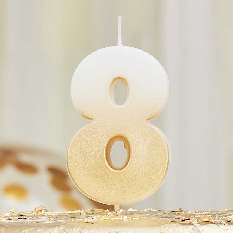 Preciosa vela número 8 en colores blanco y dorado con efecto degradado.